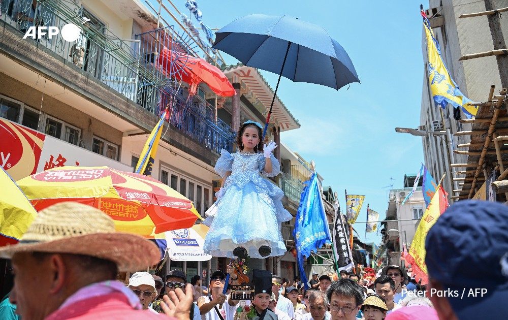 A girl participates in the "Piu Sik" parade on the island of Cheung Chau during its annual Bun festival in Hong Kong on May 15, 2024.