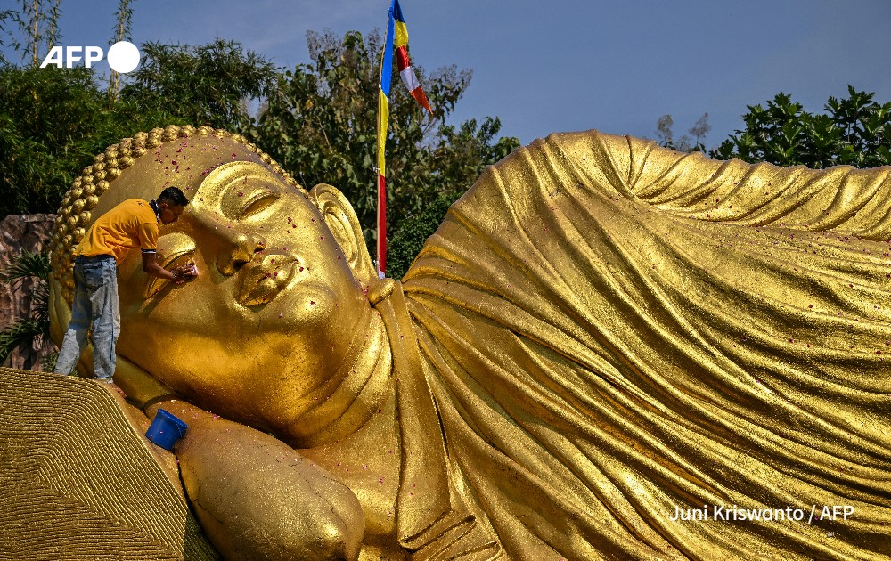 A worker cleans a Buddha statue at the Maha Vihara Mojopahit temple in Mojokerto on May 15, 2024 ahead of the Vesak festival which commemorates the birth, enlightenment and death of Buddha​.