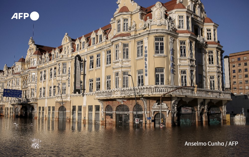 View of a flooded street at the historical city center of Porto Alegre, Rio Grande do Sul state, Brazil, on May 14, 2024. Rivers in south Brazil rose anew on Monday as flood rescue efforts intensified as President Luiz Inacio Lula da Silva conceded to authorities that were not been "prepared" for a disaster of such magnitude. More than 600,000 people have been displaced by heavy rains, flooding and mudslides that have ravaged the southern Rio Grande do Sul state for about two weeks. At least 147 people have been killed and more than 800 injured in the deluge, as rescuers searched pn Monday in boats and on jet skis for 127 people reported missing​.