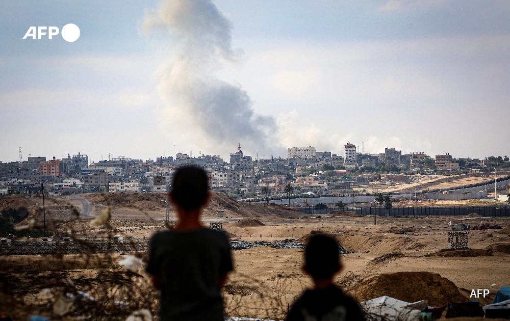 Boys watch smoke billowing during Israeli strikes east of Rafah in the southern Gaza Strip on May 13, 2024, amid the ongoing conflict between Israel and the Palestinian militant group Hamas​.