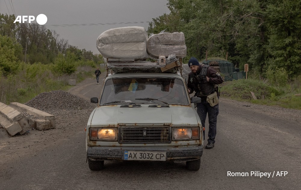 A policeman checks a car carrying people who have fled the village of Tsyrkuny, at a checkpoint outside Kharkiv, on May 13, 2024, amid the Russian invasion of Ukraine. Thousands of people have been evacuated from border areas in Ukraine's Kharkiv region, as Russia kept up constant strikes on a key town as part of a cross-border offensive, officials said on May 12, 2024. The surprise Russian attack across Ukraine's northeastern border began on Friday, with troops making small advances in an area from where they had been pushed back nearly two years ago.