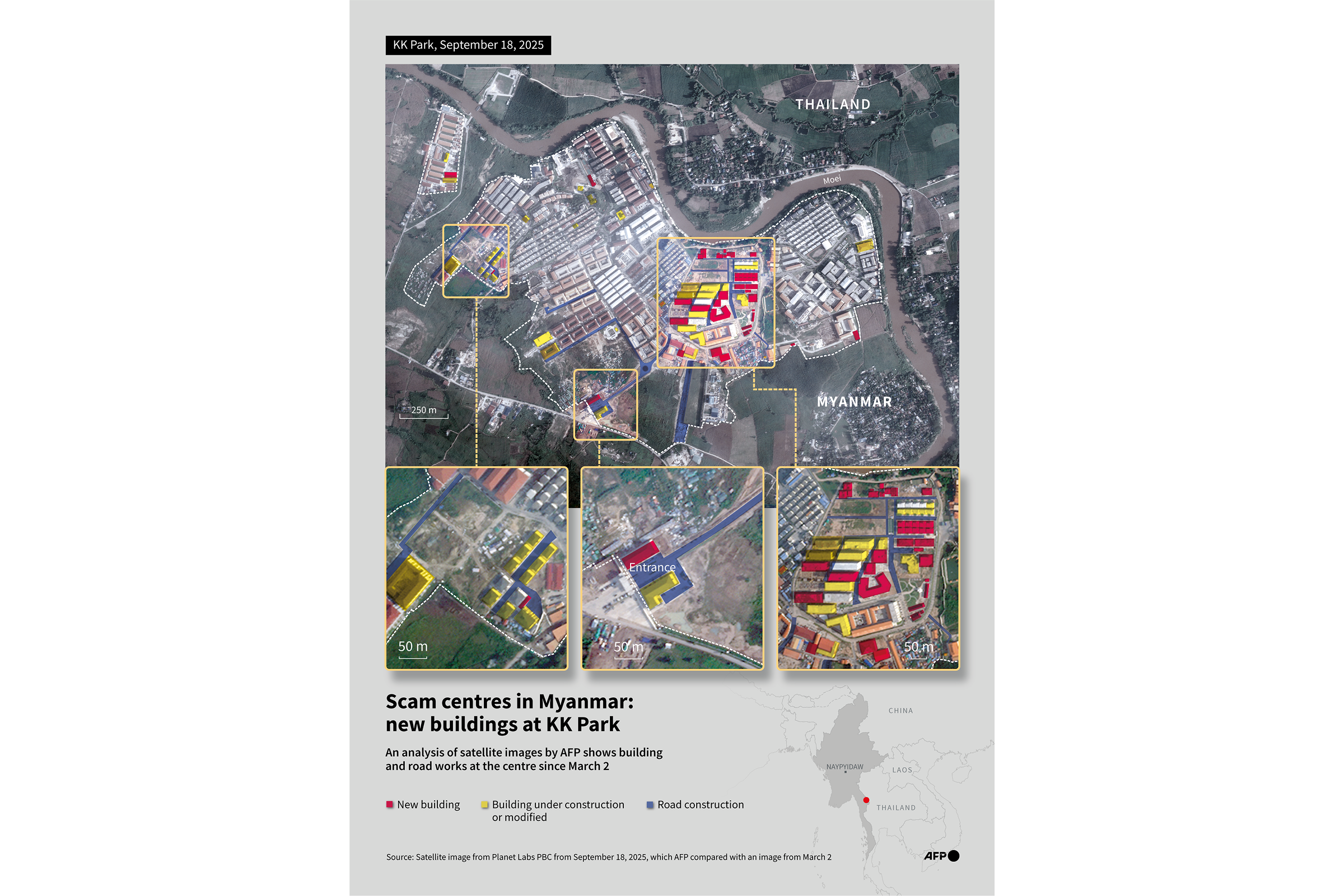 Infographic with a satellite image from Planet Labs PBC showing the scam centre KK Park in Myanmar, near the border with Thailand, and highlighting new buildings between March 2, 2025, and September 18, 2025. © Sabrina Blanchard / PLANET LABS PBC / AFP