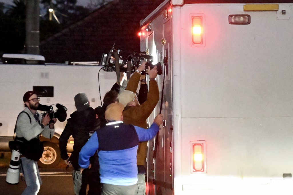 Members of the media (7th photo) follow a police vehicle transporting Erin Patterson as it leaves the Latrobe Valley Magistrates' Court in Morwell on July 7, 2025. Martin Keep AFP photographer is on left side with his DIY camera rig with two powerful flash units. © William West / AFP
