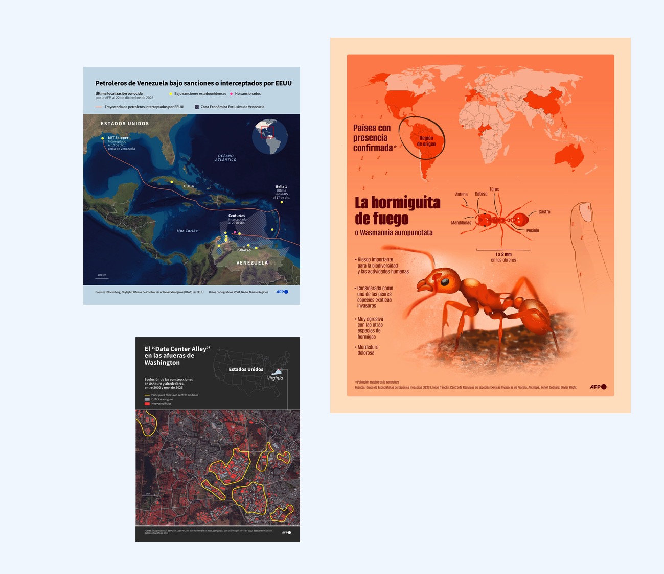 Las infografías de AFP, son diseñadas para la prensa escrita, sitios web y aplicaciones para móviles. Cubren lo esencial de la actualidad, desde las bolsas de valores a las principales competiciones deportivas, incluyendo una producción especial extraordinaria para los grandes eventos.